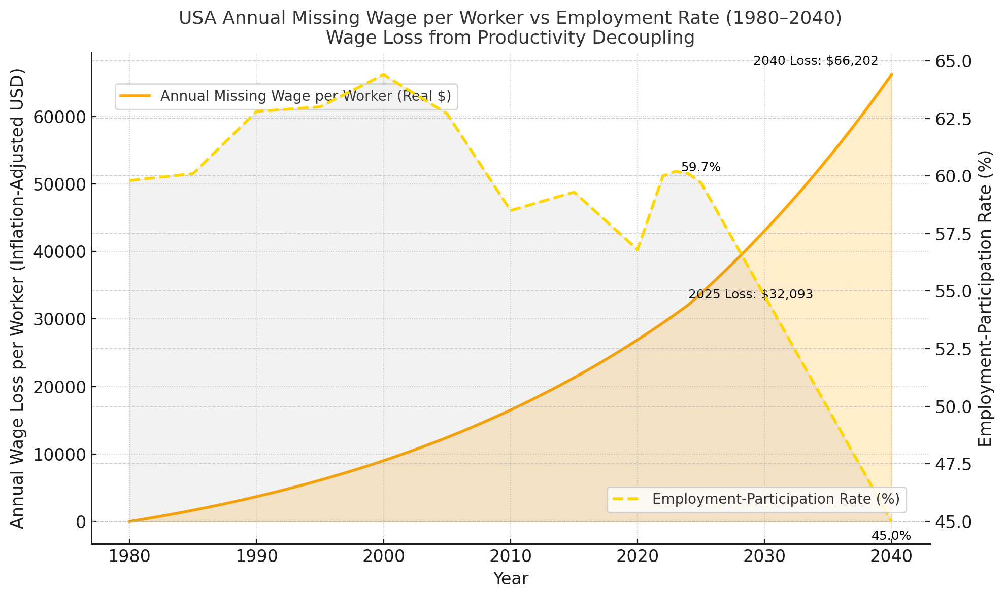 If wages had grown with productivity since 1980, the average American worker would earn about $25,000 more per year. This disconnect between productivity and compensation represents one of the fundamental failures of the modern economic system.