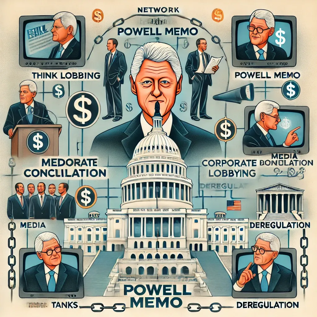 The Powell Memo, addressed to the U.S. Chamber of Commerce, called for organized corporate efforts to influence public policy, academia, media, and law to counteract perceived anti-business sentiment. By the time Clinton entered office, the memo’s goals had largely materialized through the establishment of think tanks (like the Heritage Foundation and American Enterprise Institute), lobbying groups, and the corporate capture of regulatory bodies. Clinton's administration aligned with these developments: