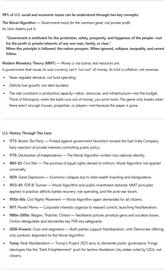- 1933–45: FDR & Truman — Moral Algorithm and public investment restored. MMT principles applied in practice: deficits fueled recovery, war spending, and the post-war boom.