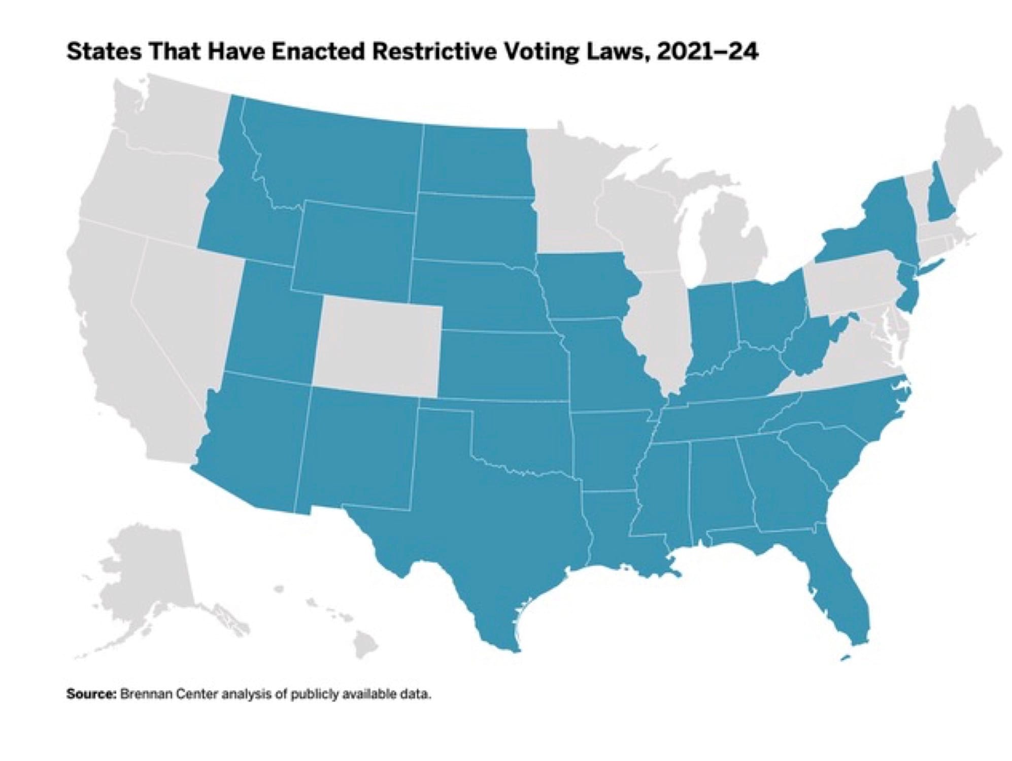 The Brennan Center for Justice reports that since the 2020 election, "at least 30 states enacted 78 restrictive laws" to blockade voting. The map of states that passed these laws closely resembles Trump's 2024 victory map—revealing the political calculation behind suppression efforts.